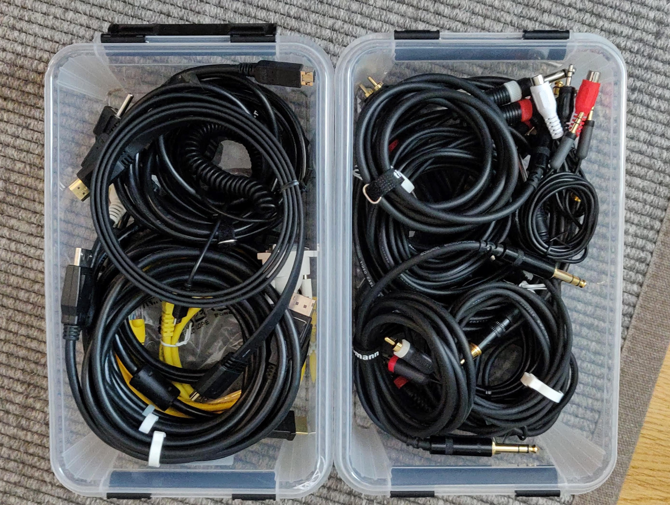 • +1 for Really Useful Boxes and velcro straps. Same here. Small boxes for home (network, video, RCA, USB, jacks, computer etc), big box for gigs, with all cables required for whatever setup I take out.
