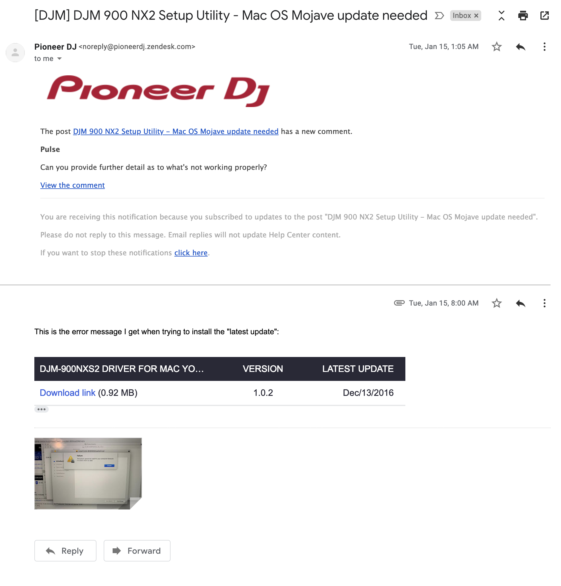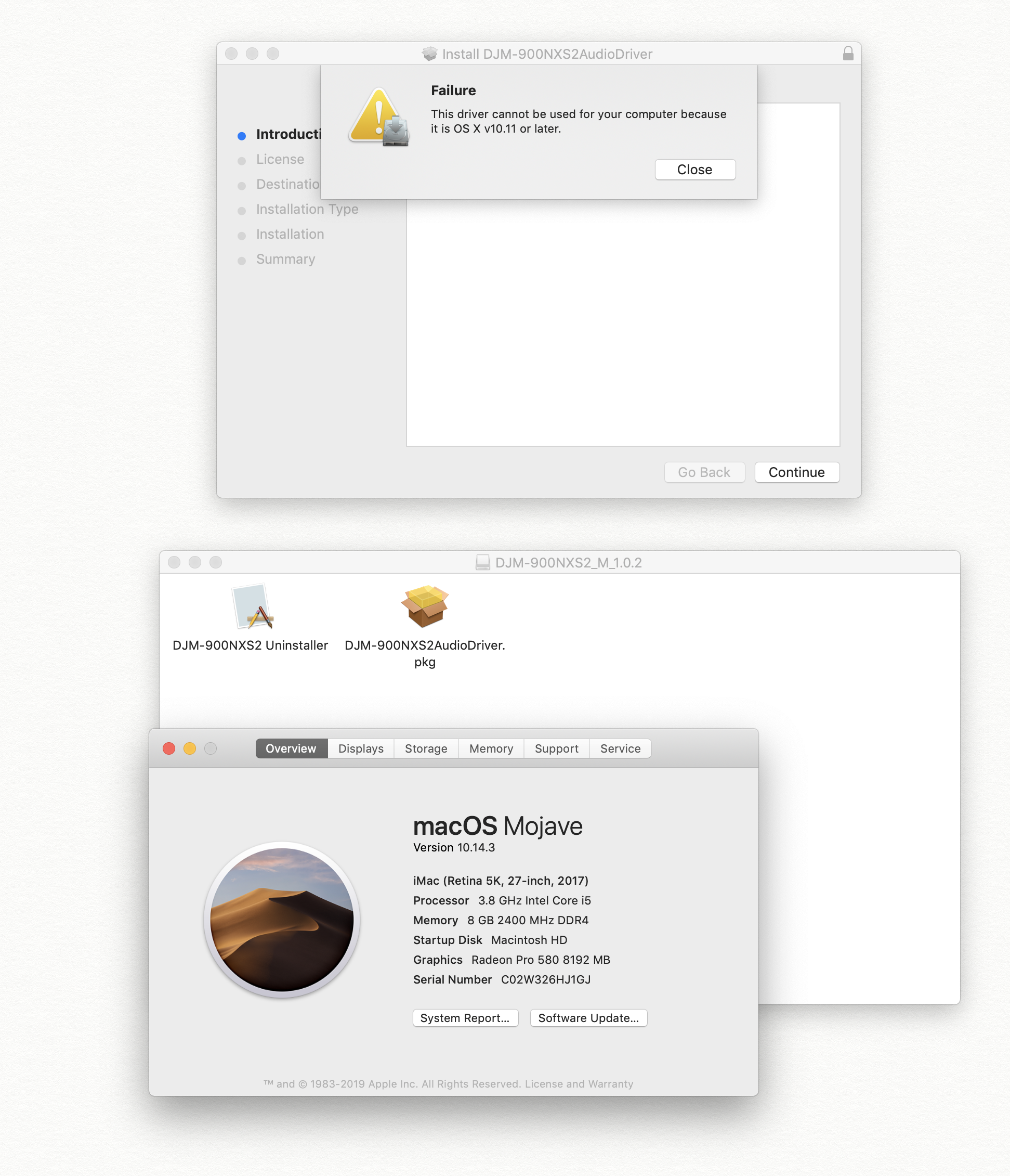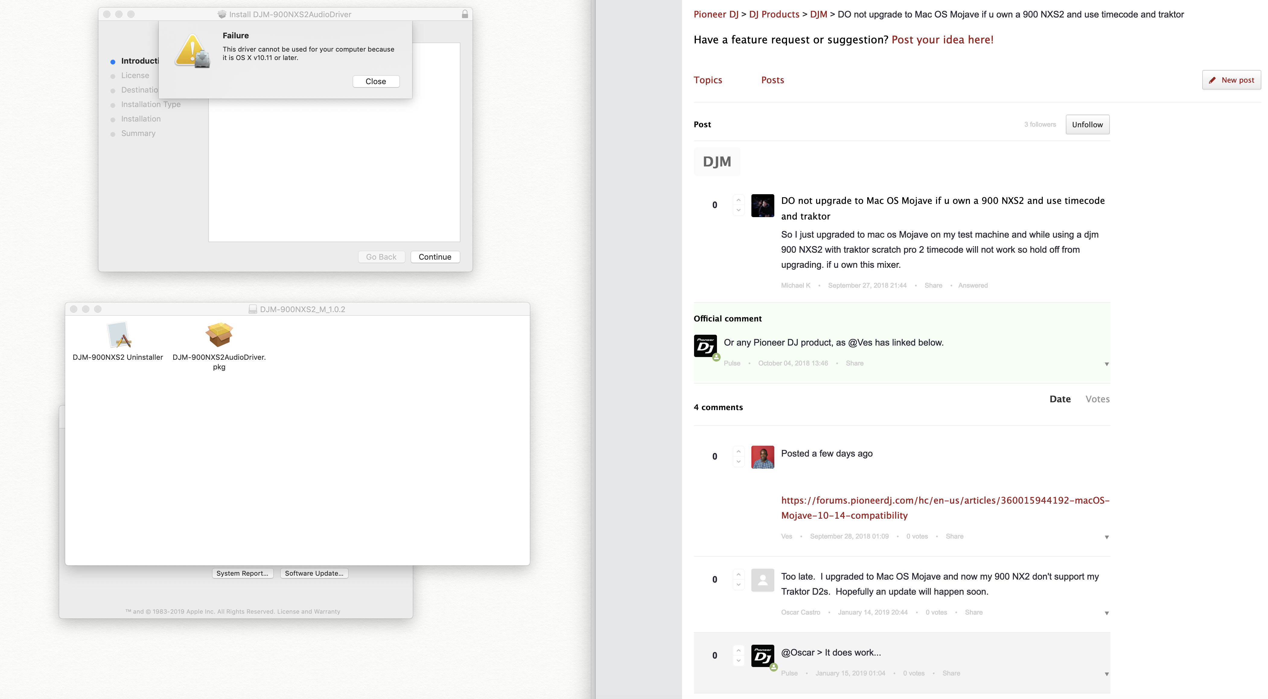 I decided to post this here since Pioneer shut down my post. Pioneer DJM 900NXS Mojave audio driver issues. Currently can’t install. https://uploads.disquscdn.com/images/f7c163e31e4c7f94abcce8766108b7c30f5785482b6bbd93ee194760a73607db.png https://uploads.disquscdn.com/images/7d9877633ee19814b13291f80a15201e545965b55d33aebbf1d43da980d02e02.png https://uploads.disquscdn.com/images/cb5bdcd867cc57a3102b19e514696b6fffc3066f0fb73f891a358a1a65fb8b34.png