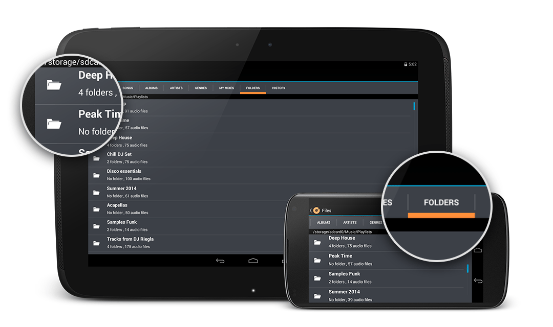 To fit the unique needs of Android users, Cross DJ for Android has now the possibility to navigate through folders, directly inside the collection. Plug a micro SD card to your device, and browse it within the app.